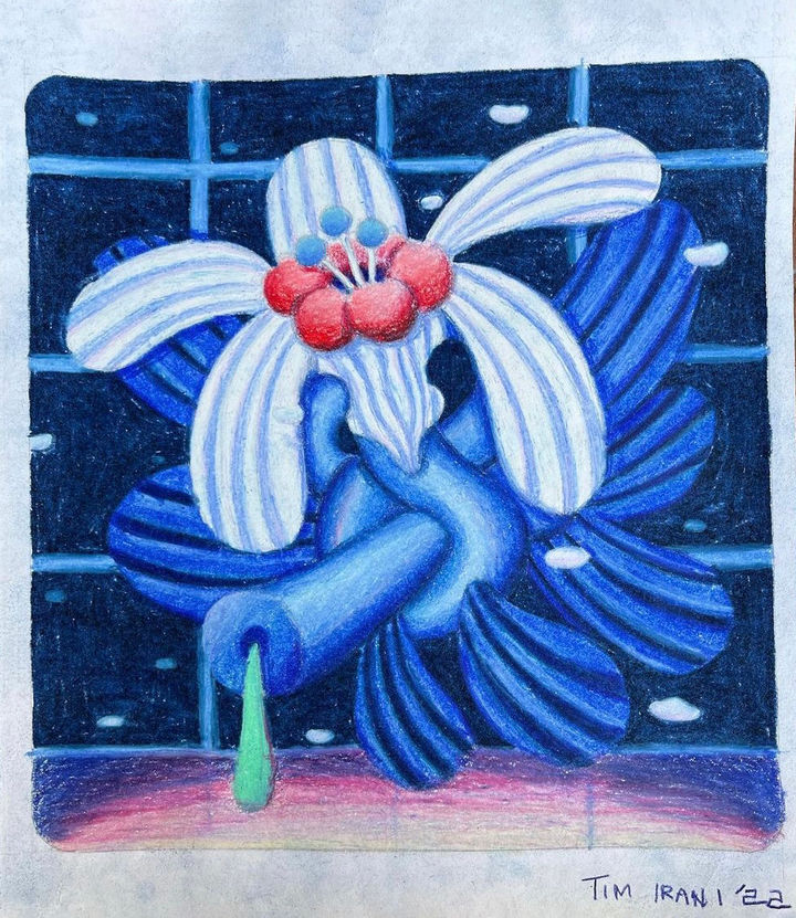 Tim Irani (b. 1989, Orange County, California) earned his degree in Architecture from the University of San Francisco before working as a mobile product designer. These skills, along with a strong interest in the sciences, inform his artistic practice which contains visual elements of computer-generated imagery and pop art. Irani’s art showcases a playfully distorted, plant-clad built environment where technology and the natural world coexist in careful balance.